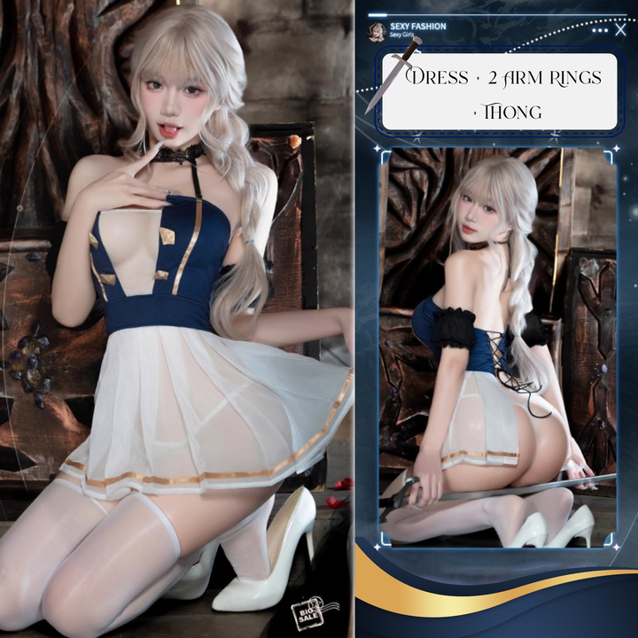 Step into your role as the Armor of Desire Knight Cosplay Dress — a fierce yet alluring cosplay set that combines delicate sheer fabric with bold straps and a playful pleated mini skirt. Designed for confident warriors who want to blend power with sensuality, this outfit is perfect for cosplay, themed events, or daring roleplay.