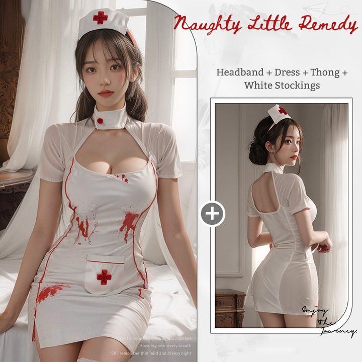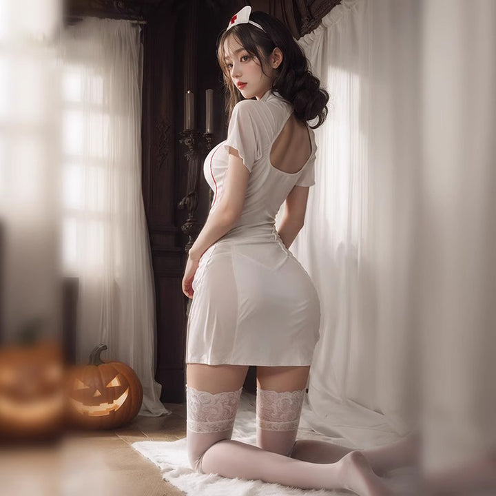 Designed in sleek white with red piping and printed blood-splatter accents, it features a fan-cut neckline, sheer mesh sides, and a flattering body-hugging fit. The matching nurse hat and pocket cross emblem complete the striking look—ideal for themed events, Halloween, or cosplay styling.