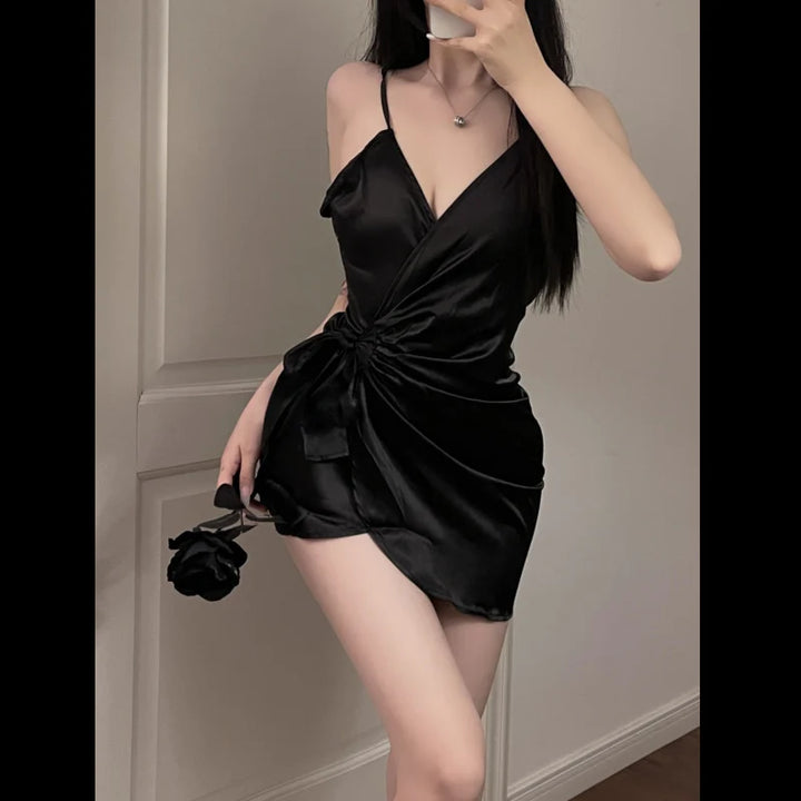 Crafted from smooth satin that drapes like liquid silk, this mini dress combines elegance with seduction in every detail.