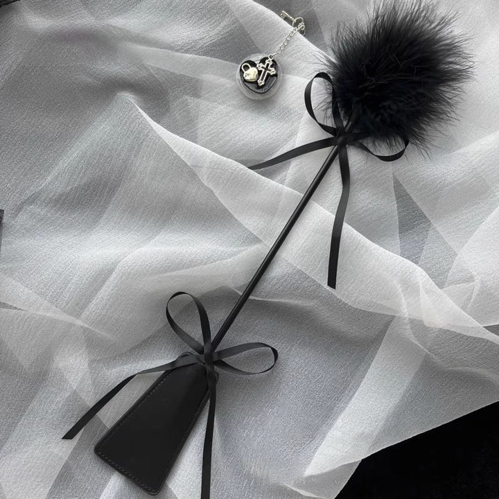 Embrace delightful duality with the Feathered Tease Enchantment Paddle. This versatile implement is designed for a full spectrum of sensation, from gentle whispers to commanding slaps. One end features a sleek, black faux leather paddle, perfect for delivering a firm, stinging impact. The other end boasts a fluffy black feather pom-pom, ideal for light, teasing caresses that build anticipation. Connected by a long, slender rod and accented with delicate satin bows at each end, this paddle is a beautiful and functional addition to any collection, allowing you to seamlessly transition between pleasure and punishment.