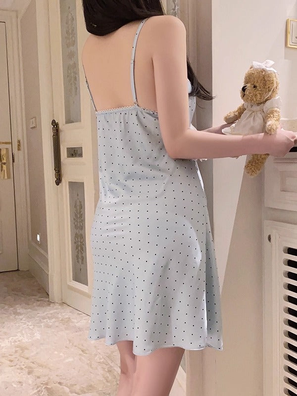 Indulge in delicate elegance with the Ice Silk Deep V Satin Chemise. Crafted from silky ice-satin fabric with a playful polka dot design, this chemise blends softness with sensual charm. The deep V neckline is adorned with floral lace and a dainty bow accent, highlighting your curves with a touch of sweetness. Its lightweight, breathable fabric ensures all-night comfort, while adjustable straps and a flowing hem offer the perfect fit. Pair it with your favorite lingerie or wear it solo for an irresistibly romantic look.