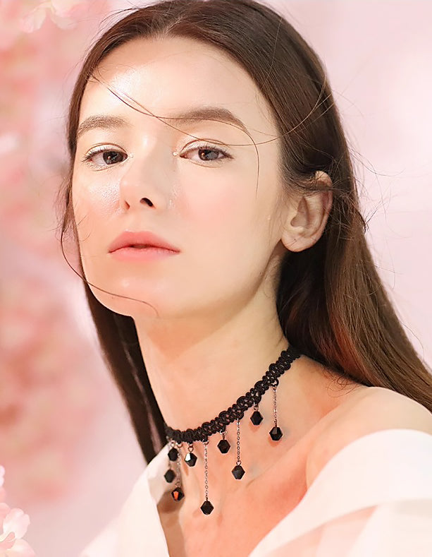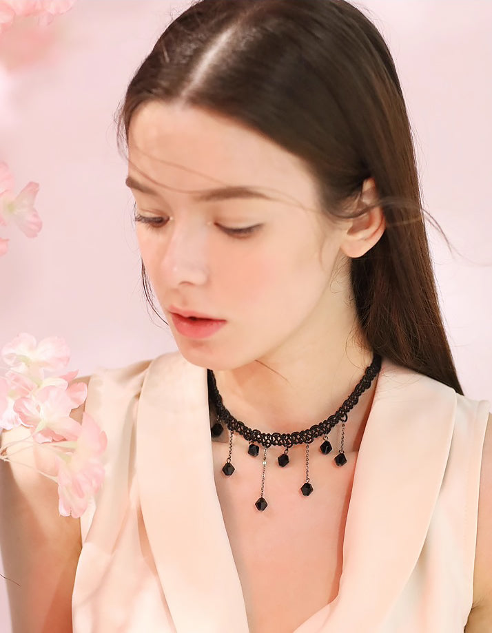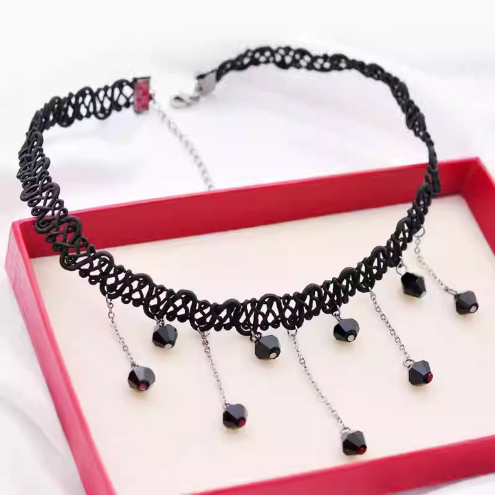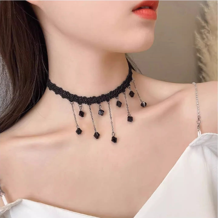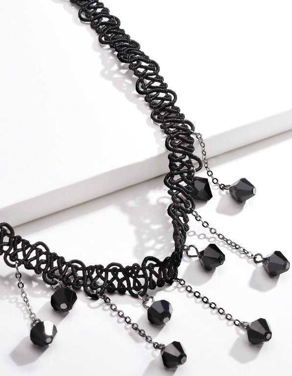 Step into dark sophistication with the Midnight Elegance Lace Bead Choker. This exquisite accessory blends vintage lace artistry with dangling crystal beads, creating a captivating dance of light and shadow at your neckline. The intricate woven lace hugs your throat with an adjustable clasp, while the beaded chains add movement and sensual charm.