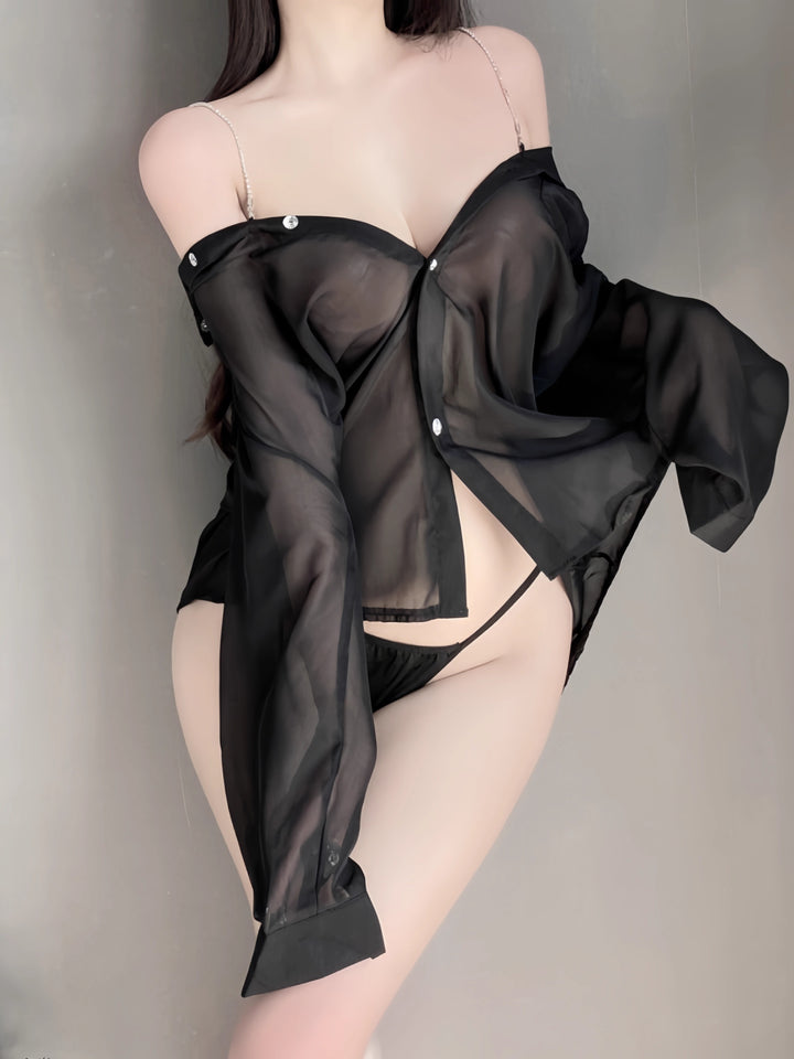 The Mist Over Skin Sheer Shirt Set captures an airy elegance with its translucent fabric and relaxed drape. Designed with a delicate button-front shirt and matching thong, this ensemble evokes effortless sensuality while maintaining a soft, minimalist charm. The sheer texture adds a mist-like allure, creating the perfect balance between subtlety and confidence.
