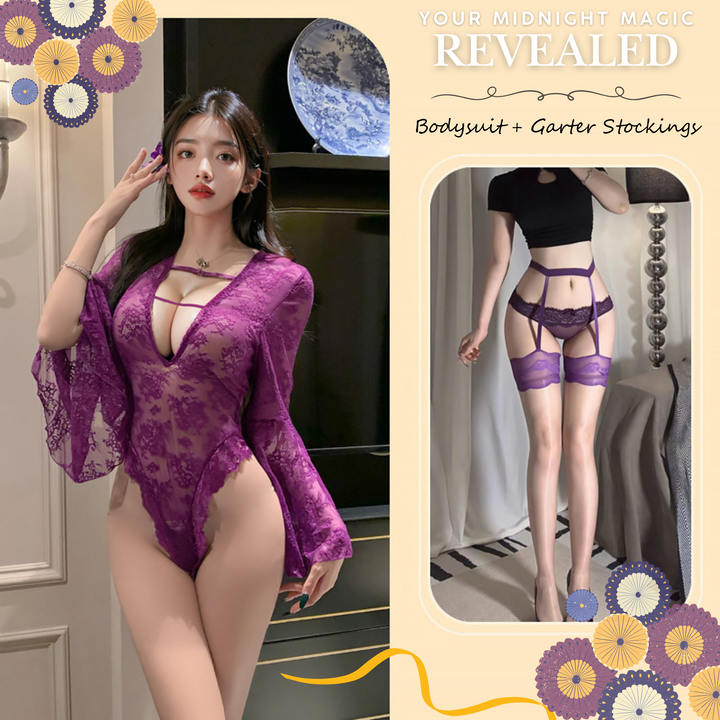 Mystic Lace Siren Bell-Sleeve Bodysuit - Purple (Bodysuit + Stockings), Mystic Lace Siren Bell-Sleeve Bodysuit - Black (Bodysuit + Stockings) |