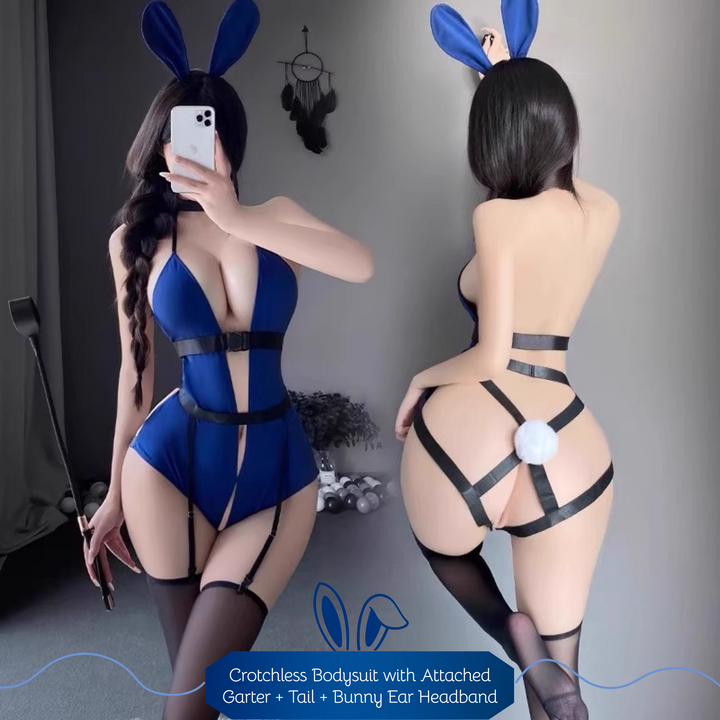 Blue (Crotchless Bodysuit with Attached Garter + Tail + Bunny Ear Headband) |