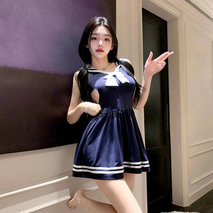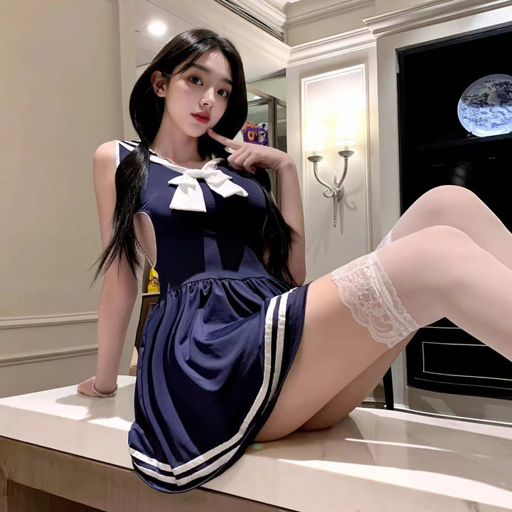 Indulge in the perfect mix of innocent charm and daring allure with the Pure Mischief Schoolgirl Cosplay Set. This figure-hugging piece features a classic navy-inspired collar, contrast white trim, and strategically placed cutouts that tease just enough. The cinched waist design enhances your curves, while the flared hemline keeps the look flirty and fun.