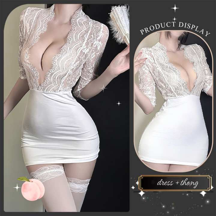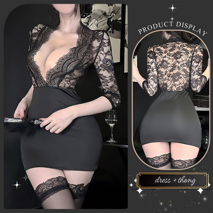 Step into the boardroom — or the after-hours rendezvous — with the Tender Secret dress. Featuring a daring deep V neckline and intricate lace that reveals just enough, this curve-hugging secretary dress brings out your confident, sexy side. Perfect for office roleplay or special evenings.