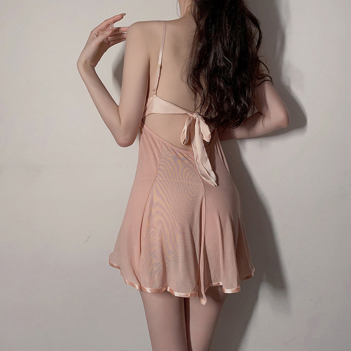 Step into dreamy allure with the Moonkiss Chiffon Sheer Pink Lace Dress. Crafted from airy blush-pink chiffon, this nightdress drapes your silhouette with an angelic yet sensual touch. The deep V neckline is trimmed with intricate lace, drawing attention to your curves, while the satin bow detail adds a touch of sweetness. Adjustable straps and a soft tie-back ensure a perfect fit, revealing just enough for a teasing glimpse of bare skin. The sheer skirt flows effortlessly with every move, paired with a matching T-back panty to complete the seductive set.