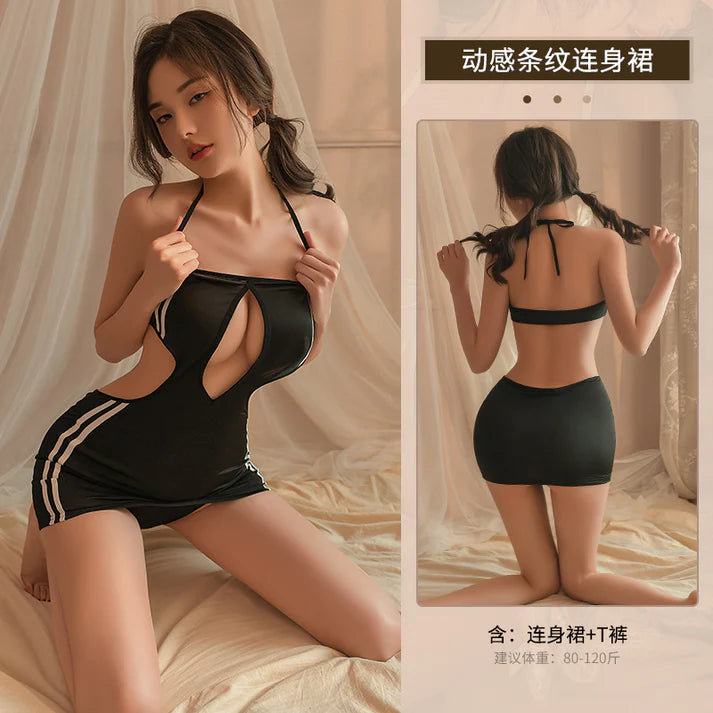 Striped Halter Cut-Out Secretary Lingerie Dress Set